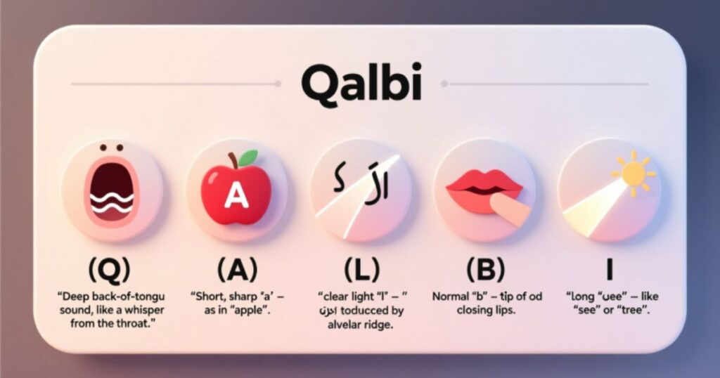 The word “Qalbi” is pronounced using the IPA notation /qal.biː/.